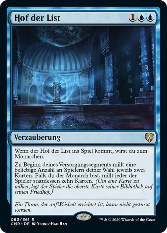 | Rules | When Court of Cunning enters the battlefield, you become the monarch. At the beginning of your upkeep, any number of target players each mill two cards. If you're the monarch, each of those players mills ten cards instead. (To mill a card, a player puts the top card of their library into their graveyard.) |