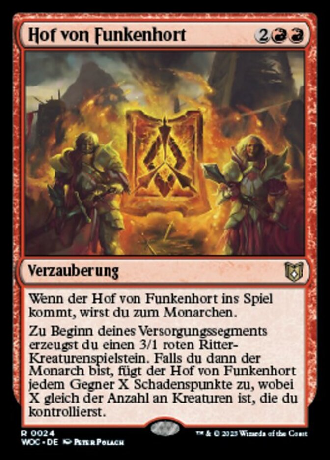 | Rules | When Court of Embereth enters the battlefield, you become the monarch. At the beginning of your upkeep, create a 3/1 red Knight creature token. Then if you're the monarch, Court of Embereth deals X damage to each opponent, where X is the number of creatures you control. |