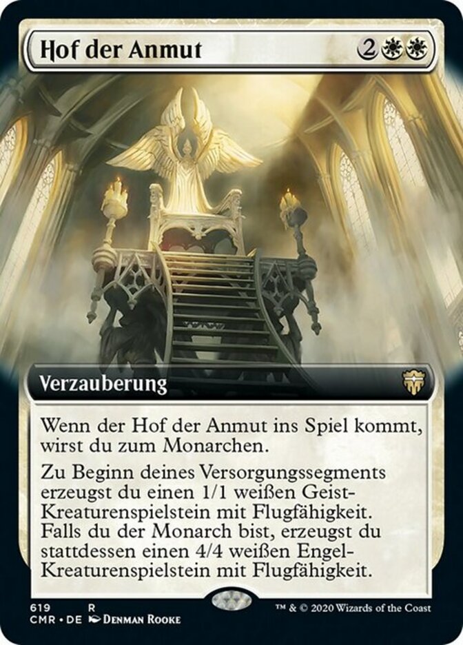 | Rules | When Court of Grace enters the battlefield, you become the monarch. At the beginning of your upkeep, create a 1/1 white Spirit creature token with flying. If you're the monarch, create a 4/4 white Angel creature token with flying instead. |