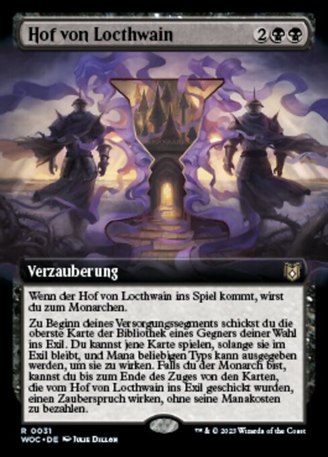 | Rules | When Court of Locthwain enters the battlefield, you become the monarch. At the beginning of your upkeep, exile the top card of target opponent's library. You may play that card for as long as it remains exiled, and mana of any type can be spent to cast it. If you're the monarch, until end of turn, you may cast a spell from among cards exiled with Court of Locthwain without paying its mana cost. |