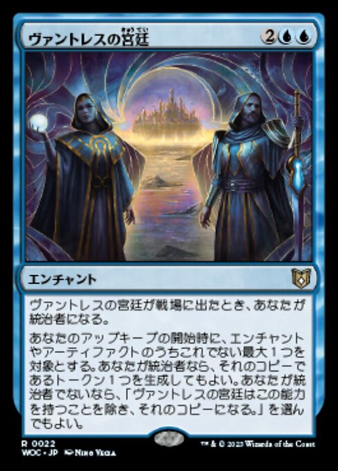 | Rules | When Court of Vantress enters the battlefield, you become the monarch. At the beginning of your upkeep, choose up to one other target enchantment or artifact. If you're the monarch, you may create a token that's a copy of it. If you're not the monarch, you may have Court of Vantress become a copy of it, except it has this ability. |