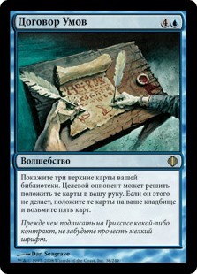 | Rules | Reveal the top three cards of your library. Target opponent may choose to put those cards into your hand. If they don't, put those cards into your graveyard and draw five cards. |
