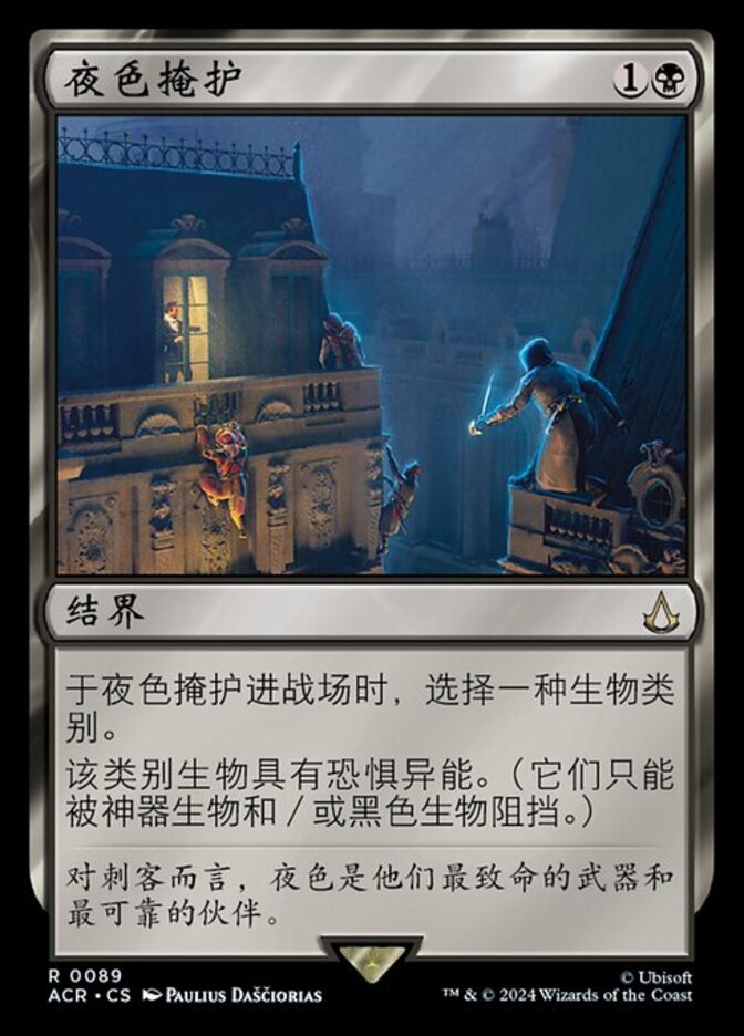 | Rules | As Cover of Darkness enters the battlefield, choose a creature type. Creatures of the chosen type have fear. (They can't be blocked except by artifact creatures and/or black creatures.) |