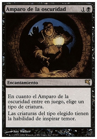 | Rules | As Cover of Darkness enters the battlefield, choose a creature type. Creatures of the chosen type have fear. (They can't be blocked except by artifact creatures and/or black creatures.) |