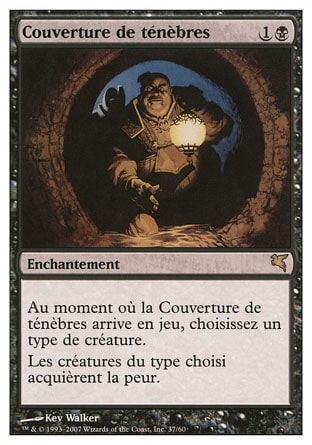| Rules | As Cover of Darkness enters the battlefield, choose a creature type. Creatures of the chosen type have fear. (They can't be blocked except by artifact creatures and/or black creatures.) |