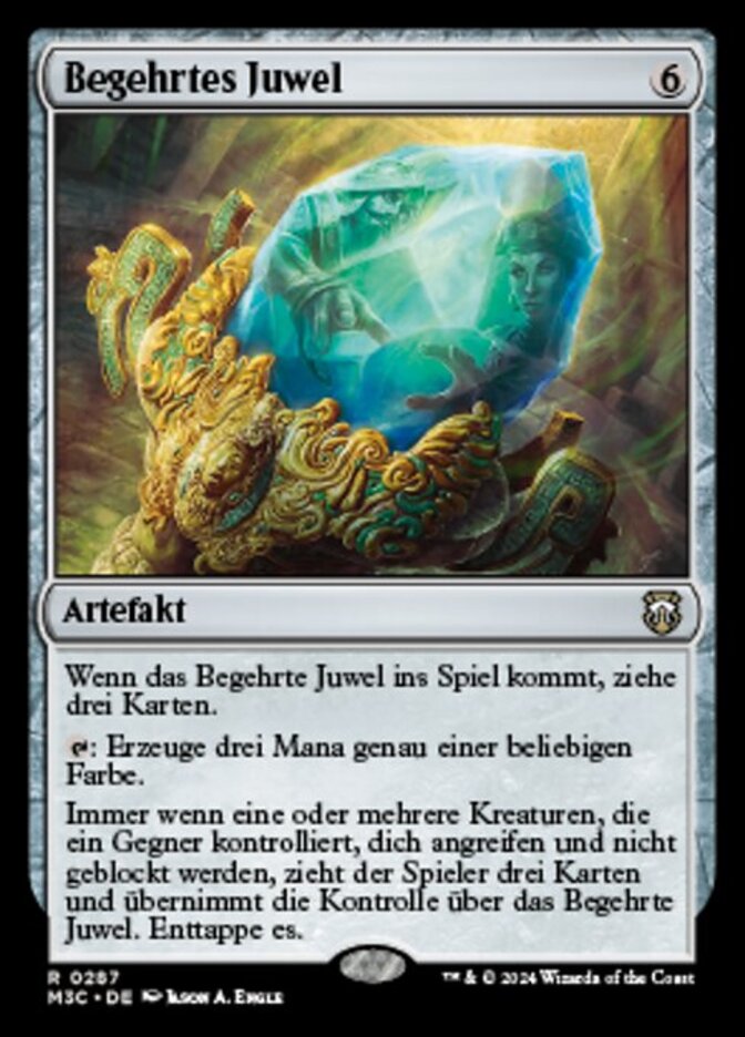 | Rules | When Coveted Jewel enters the battlefield, draw three cards. : Add three mana of any one color. Whenever one or more creatures an opponent controls attack you and aren't blocked, that player draws three cards and gains control of Coveted Jewel. Untap it. |