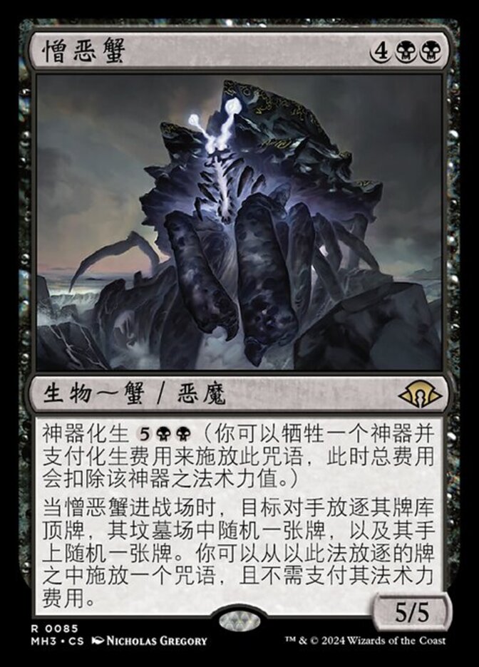 | Rules | Emerge from artifact (You may cast this spell by sacrificing an artifact and paying the emerge cost reduced by that artifact's mana value.) When Crabomination enters the battlefield, target opponent exiles the top card of their library, a card at random from their graveyard, and a card at random from their hand. You may cast a spell from among cards exiled this way without paying its mana cost. |