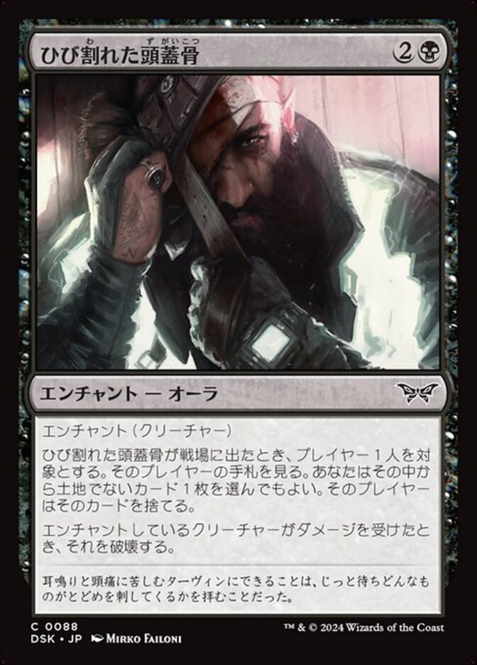 | Rules | Enchant creature When Cracked Skull enters, look at target player's hand. You may choose a nonland card from it. That player discards that card. When enchanted creature is dealt damage, destroy it. |