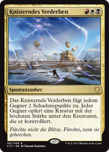 | Rules | Crackling Doom deals 2 damage to each opponent. Each opponent sacrifices a creature with the greatest power among creatures that player controls. |