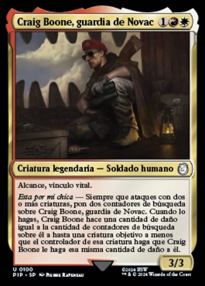 | Rules | Reach, lifelink One for My Baby — Whenever you attack with two or more creatures, put two quest counters on Craig Boone, Novac Guard. When you do, Craig Boone deals damage equal to the number of quest counters on it to up to one target creature unless that creature's controller has Craig Boone deal that much damage to them. |