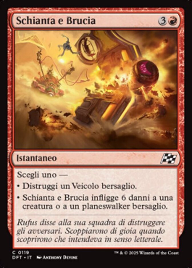 | Rules | Choose one — • Destroy target Vehicle. • Crash and Burn deals 6 damage to target creature or planeswalker. |