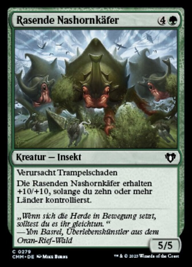 | Rules | Trample Crash of Rhino Beetles gets +10/+10 as long as you control ten or more lands. |