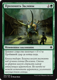 | Flavor | The Legion's conquistadors could endure Ixalan's sun. Their forts could withstand a charging ceratops. But nothing can stop a ceratops strengthened by the sun. |