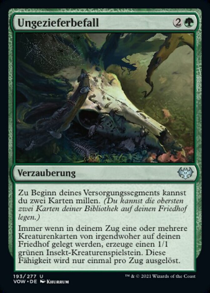 | Rules | At the beginning of your upkeep, you may mill two cards. (You may put the top two cards of your library into your graveyard.) Whenever one or more creature cards are put into your graveyard from anywhere during your turn, create a 1/1 green Insect creature token. This ability triggers only once each turn. |