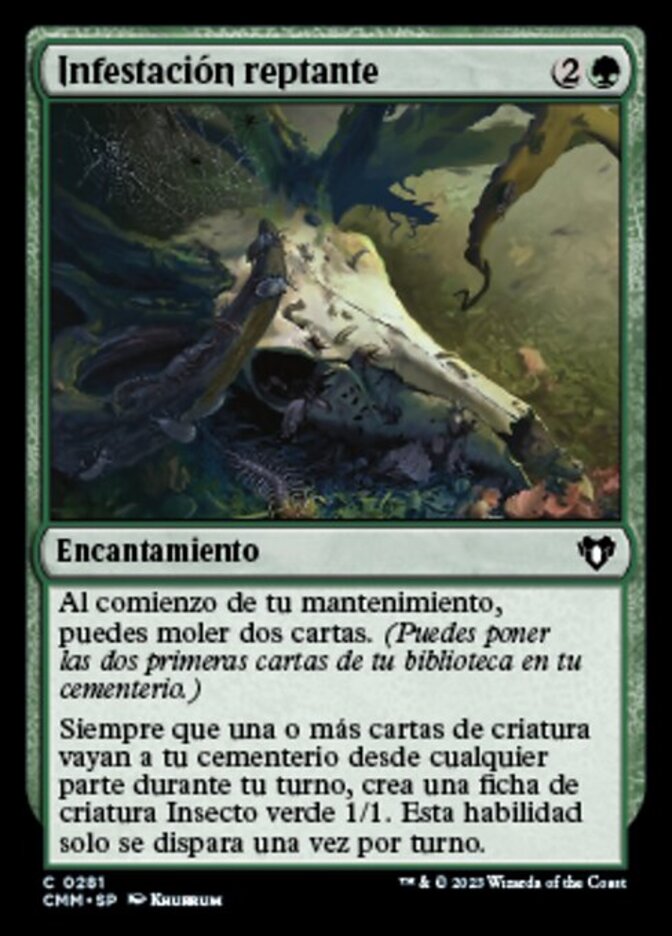 | Rules | At the beginning of your upkeep, you may mill two cards. (You may put the top two cards of your library into your graveyard.) Whenever one or more creature cards are put into your graveyard from anywhere during your turn, create a 1/1 green Insect creature token. This ability triggers only once each turn. |