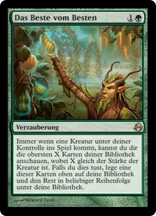 | Rules | Whenever a creature enters the battlefield under your control, you may look at the top X cards of your library, where X is that creature's power. If you do, put one of those cards on top of your library and the rest on the bottom of your library in any order. |