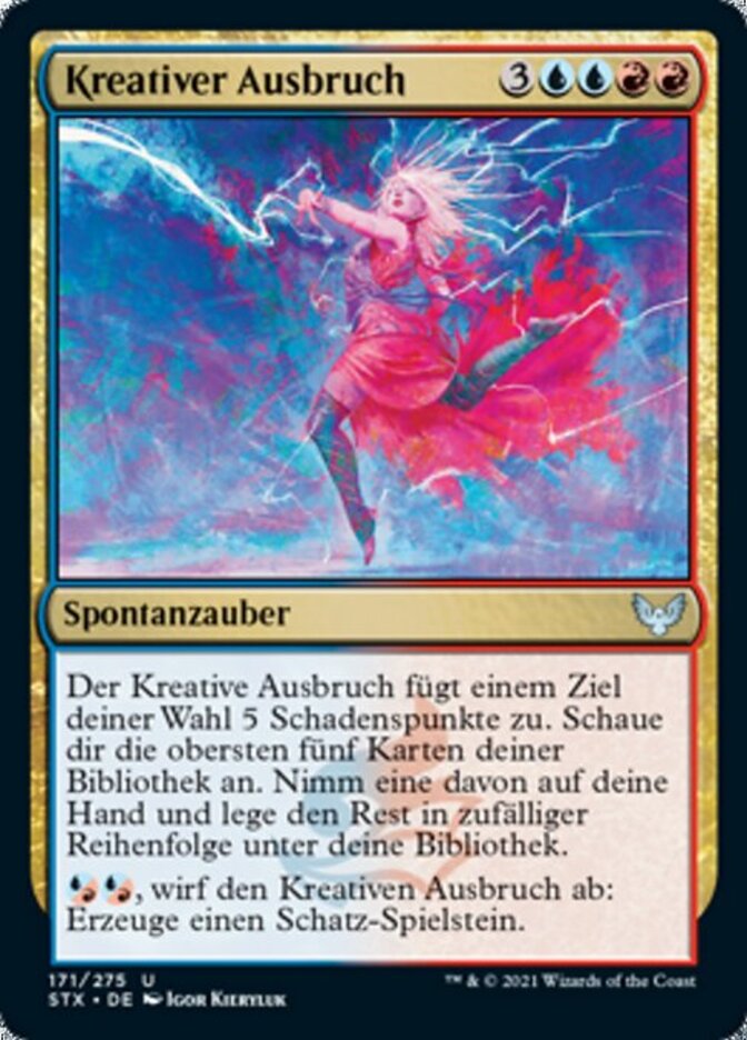 | Rules | Creative Outburst deals 5 damage to any target. Look at the top five cards of your library. Put one of them into your hand and the rest on the bottom of your library in a random order. , Discard Creative Outburst: Create a Treasure token. |