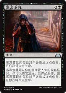 | Rules | Creeping Chill deals 3 damage to each opponent and you gain 3 life. When Creeping Chill is put into your graveyard from your library, you may exile it. If you do, Creeping Chill deals 3 damage to each opponent and you gain 3 life. |
