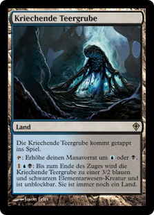 | Rules | Creeping Tar Pit enters the battlefield tapped. : Add or . : Creeping Tar Pit becomes a 3/2 blue and black Elemental creature until end of turn and can't be blocked this turn. It's still a land. |
