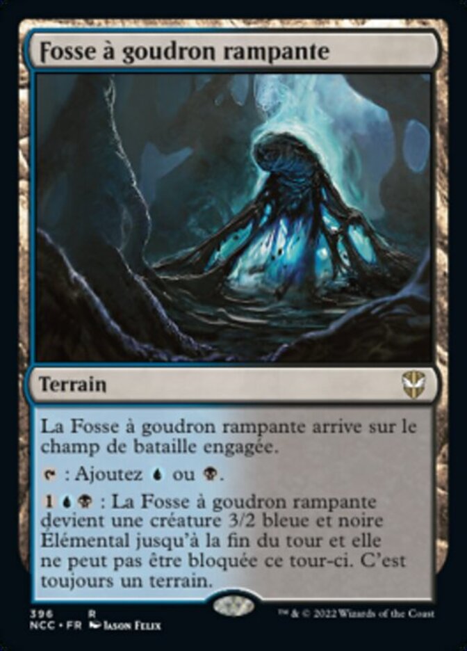 | Rules | Creeping Tar Pit enters the battlefield tapped. : Add or . : Creeping Tar Pit becomes a 3/2 blue and black Elemental creature until end of turn and can't be blocked this turn. It's still a land. |
