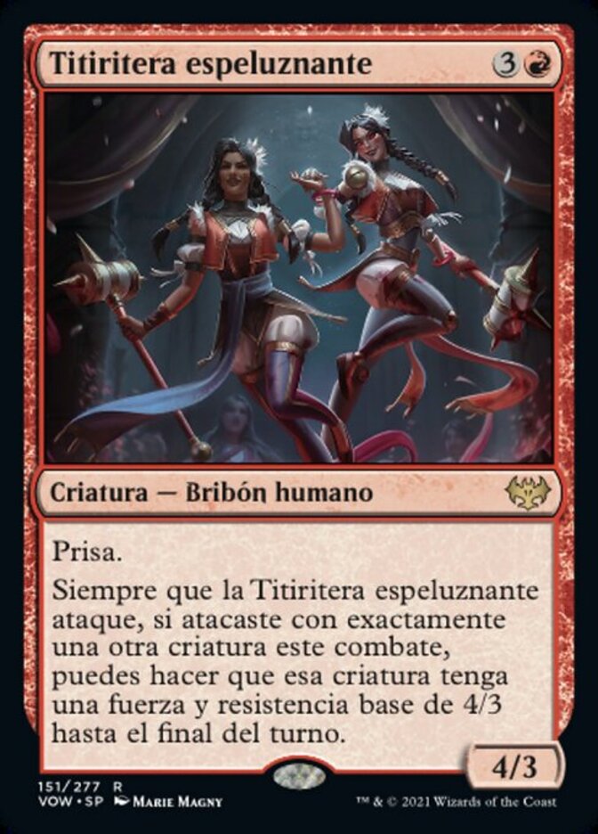 | Rules | Haste Whenever Creepy Puppeteer attacks, if you attacked with exactly one other creature this combat, you may have that creature's base power and toughness become 4/3 until end of turn. |