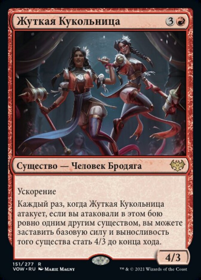 | Rules | Haste Whenever Creepy Puppeteer attacks, if you attacked with exactly one other creature this combat, you may have that creature's base power and toughness become 4/3 until end of turn. |