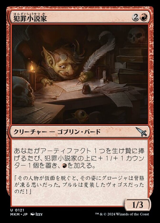 | Rules | Whenever you sacrifice an artifact, put a +1/+1 counter on Crime Novelist and add . |