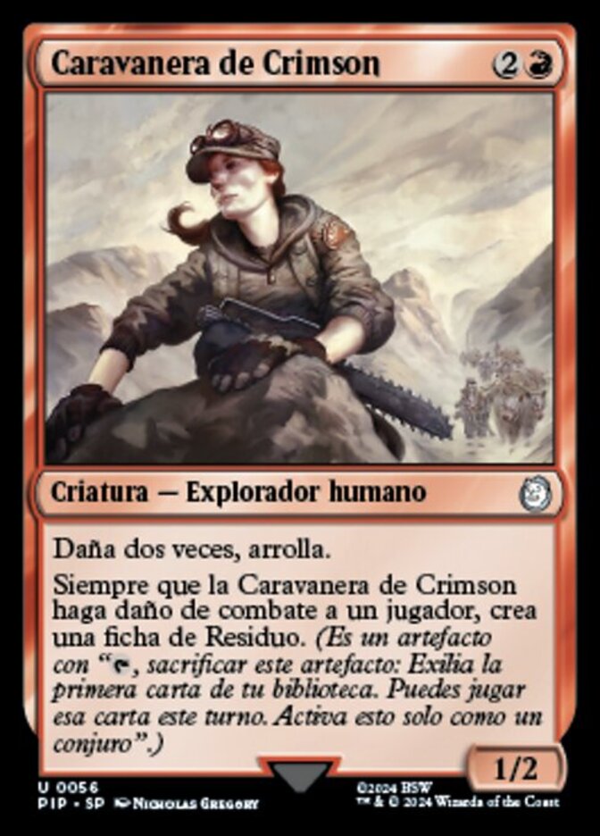 | Rules | Double strike, trample Whenever Crimson Caravaneer deals combat damage to a player, create a Junk token. (It's an artifact with ", Sacrifice this artifact: Exile the top card of your library. You may play that card this turn. Activate only as a sorcery.") |