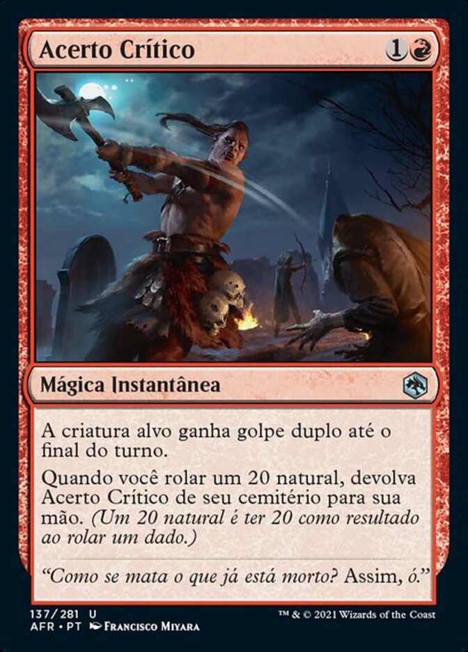 | Rules | Target creature gains double strike until end of turn. When you roll a natural 20, return Critical Hit from your graveyard to your hand. (A natural 20 is a roll that displays 20 on the die.) |