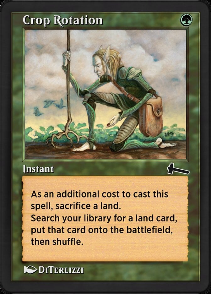 | Rules | As an additional cost to cast this spell, sacrifice a land. Search your library for a land card, put that card onto the battlefield, then shuffle. |