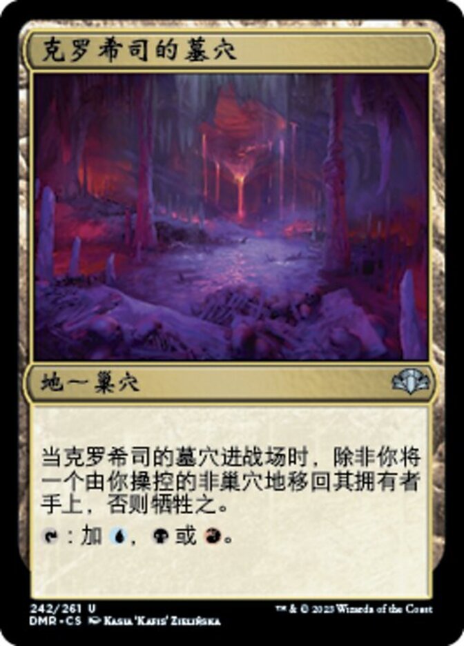 | Rules | When Crosis's Catacombs enters the battlefield, sacrifice it unless you return a non-Lair land you control to its owner's hand. : Add , , or . |