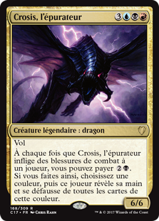 | Rules | Flying Whenever Crosis, the Purger deals combat damage to a player, you may pay . If you do, choose a color, then that player reveals their hand and discards all cards of that color. |