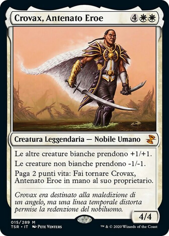 | Rules | Other white creatures get +1/+1. Nonwhite creatures get -1/-1. Pay 2 life: Return Crovax, Ascendant Hero to its owner's hand. |