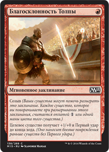 | Rules | Convoke (Your creatures can help cast this spell. Each creature you tap while casting this spell pays for or one mana of that creature's color.) Target creature gets +1/+0 and gains first strike until end of turn. (It deals combat damage before creatures without first strike.) |