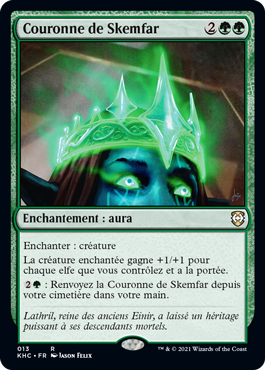 | Rules | Enchant creature Enchanted creature gets +1/+1 for each Elf you control and has reach. : Return Crown of Skemfar from your graveyard to your hand. |