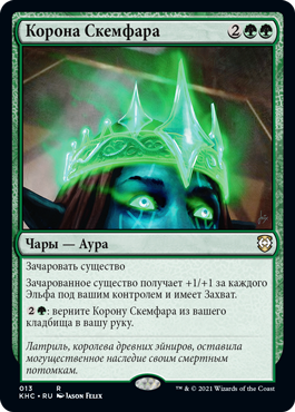 | Rules | Enchant creature Enchanted creature gets +1/+1 for each Elf you control and has reach. : Return Crown of Skemfar from your graveyard to your hand. |