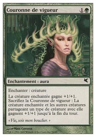 | Rules | Enchant creature Enchanted creature gets +1/+1. Sacrifice Crown of Vigor: Enchanted creature and other creatures that share a creature type with it get +1/+1 until end of turn. |