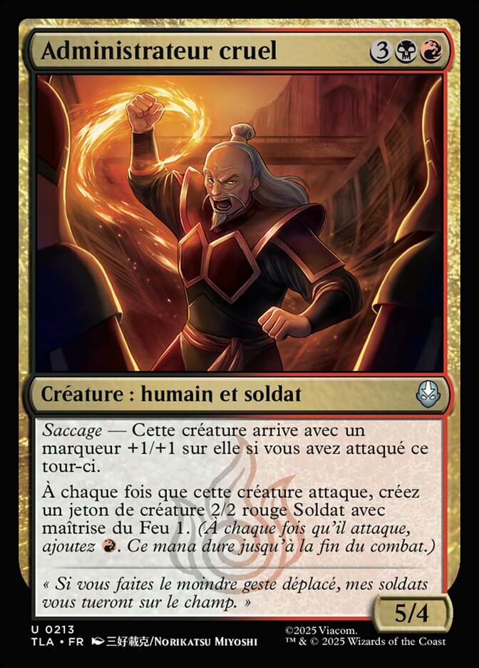 | Rules | Raid — This creature enters with a +1/+1 counter on it if you attacked this turn. Whenever this creature attacks, create a 2/2 red Soldier creature token with firebending 1. (Whenever it attacks, add . This mana lasts until end of combat.) |