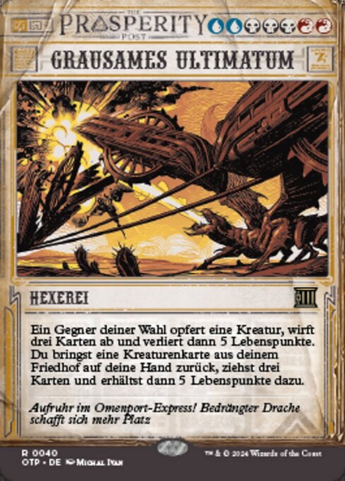 | Rules | Target opponent sacrifices a creature, discards three cards, then loses 5 life. You return a creature card from your graveyard to your hand, draw three cards, then gain 5 life. |