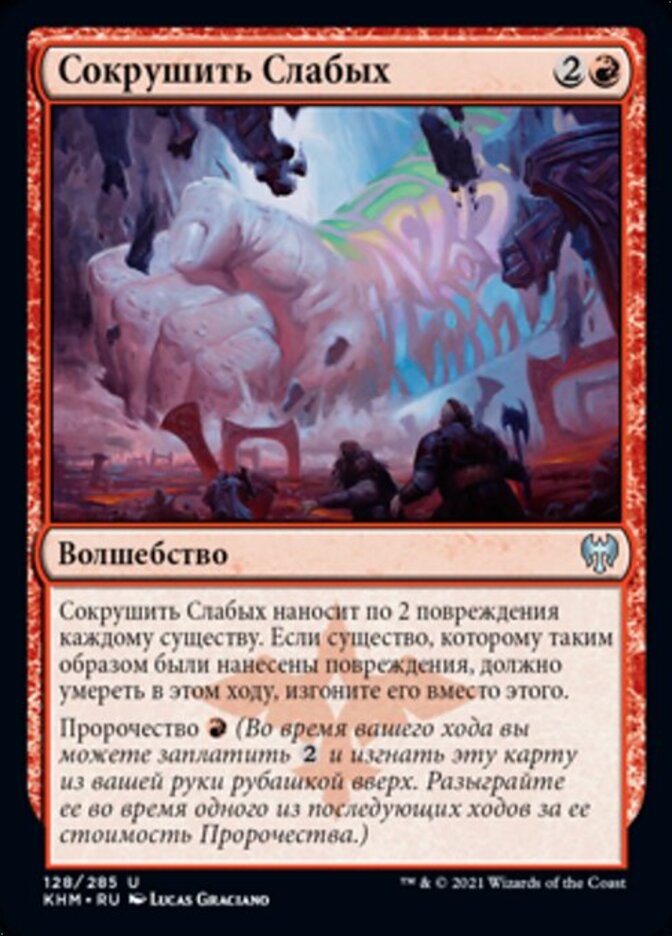 | Rules | Crush the Weak deals 2 damage to each creature. If a creature dealt damage this way would die this turn, exile it instead. Foretell (During your turn, you may pay and exile this card from your hand face down. Cast it on a later turn for its foretell cost.) |