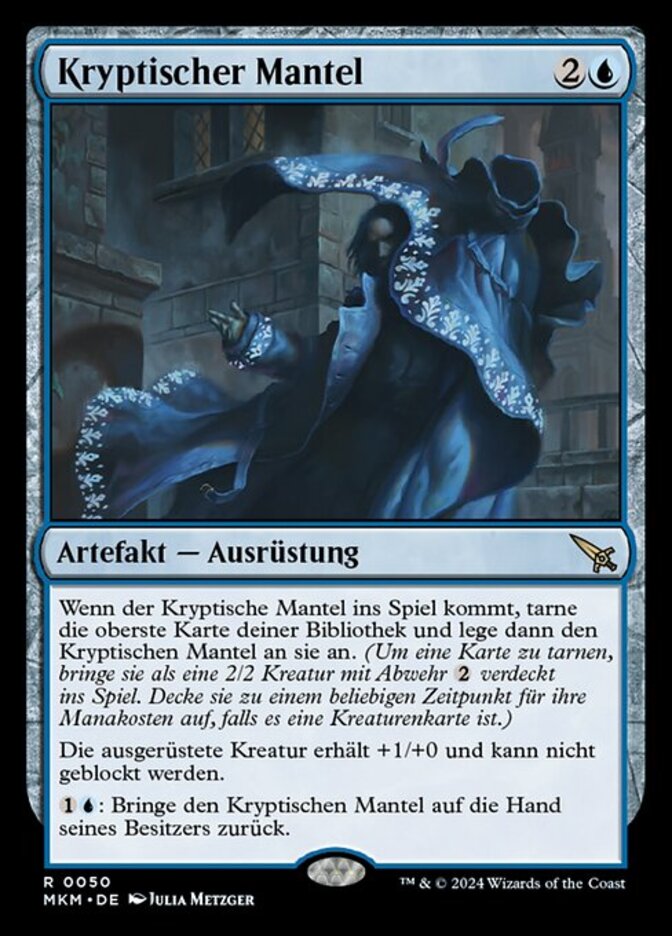| Rules | When Cryptic Coat enters the battlefield, cloak the top card of your library, then attach Cryptic Coat to it. (To cloak a card, put it onto the battlefield face down as a 2/2 creature with ward . Turn it face up any time for its mana cost if it's a creature card.) Equipped creature gets +1/+0 and can't be blocked. : Return Cryptic Coat to its owner's hand. |