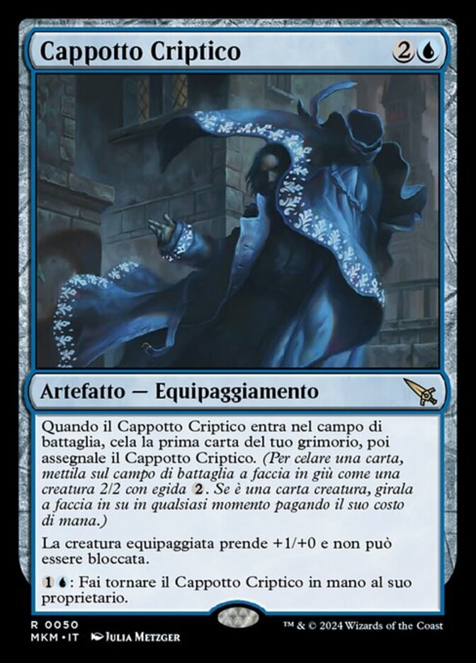 | Rules | When Cryptic Coat enters the battlefield, cloak the top card of your library, then attach Cryptic Coat to it. (To cloak a card, put it onto the battlefield face down as a 2/2 creature with ward . Turn it face up any time for its mana cost if it's a creature card.) Equipped creature gets +1/+0 and can't be blocked. : Return Cryptic Coat to its owner's hand. |