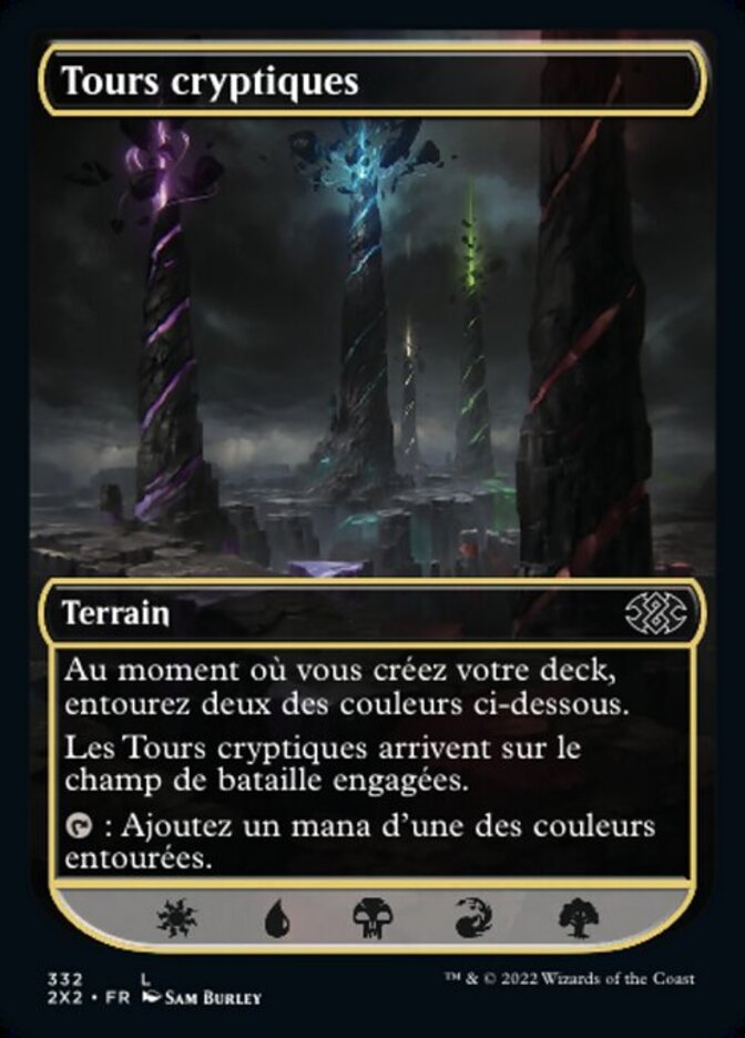 | Rules | As you create your deck, circle two of the colors below. Cryptic Spires enters the battlefield tapped. : Add one mana of either of the circled colors. |