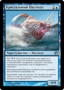 | Rules | Bestow (If you cast this card for its bestow cost, it's an Aura spell with enchant creature. It becomes a creature again if it's not attached to a creature.) When Crystalline Nautilus becomes the target of a spell or ability, sacrifice it. Enchanted creature gets +4/+4 and has "When this creature becomes the target of a spell or ability, sacrifice it." |
