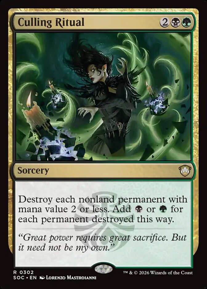 | Rules | Destroy each nonland permanent with mana value 2 or less. Add or for each permanent destroyed this way. |