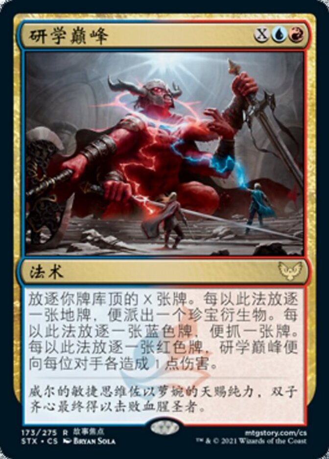 | Rules | Exile the top X cards of your library. For each land card exiled this way, create a Treasure token. For each blue card exiled this way, draw a card. For each red card exiled this way, Culmination of Studies deals 1 damage to each opponent. |
