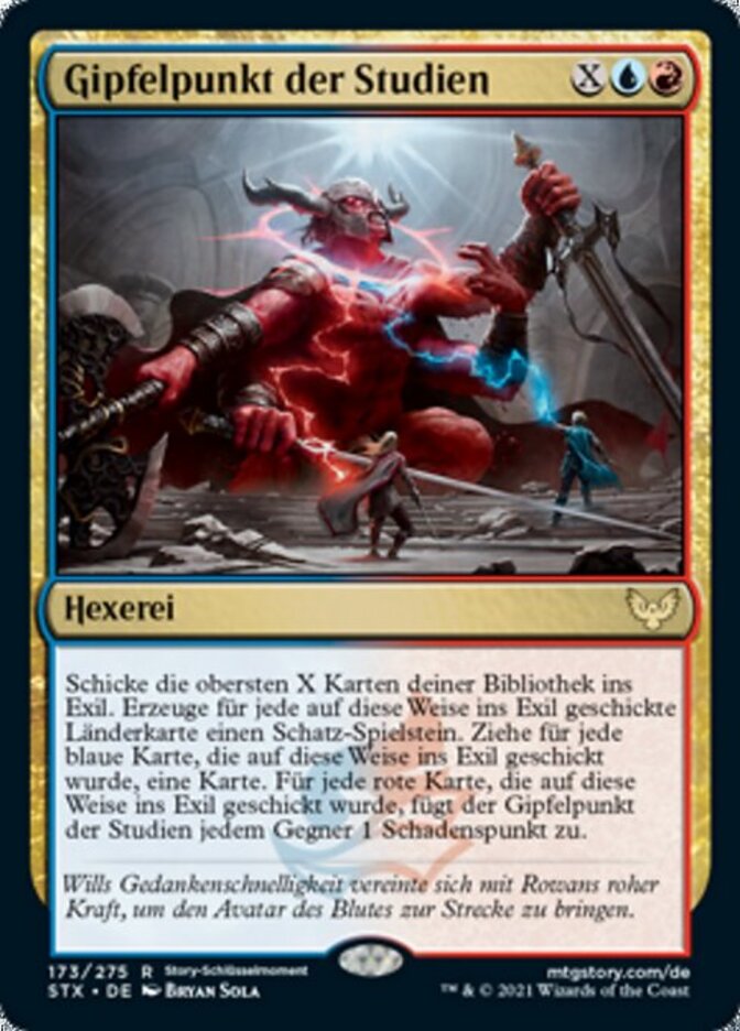 | Rules | Exile the top X cards of your library. For each land card exiled this way, create a Treasure token. For each blue card exiled this way, draw a card. For each red card exiled this way, Culmination of Studies deals 1 damage to each opponent. |