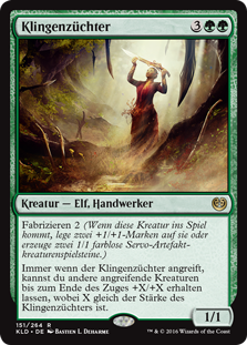 | Rules | Fabricate 2 (When this creature enters the battlefield, put two +1/+1 counters on it or create two 1/1 colorless Servo artifact creature tokens.) Whenever Cultivator of Blades attacks, you may have other attacking creatures get +X/+X until end of turn, where X is Cultivator of Blades's power. |