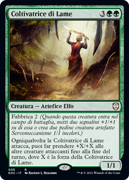 | Rules | Fabricate 2 (When this creature enters the battlefield, put two +1/+1 counters on it or create two 1/1 colorless Servo artifact creature tokens.) Whenever Cultivator of Blades attacks, you may have other attacking creatures get +X/+X until end of turn, where X is Cultivator of Blades's power. |