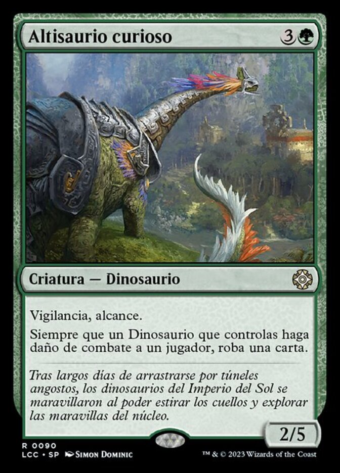 | Rules | Vigilance, reach Whenever a Dinosaur you control deals combat damage to a player, draw a card. |